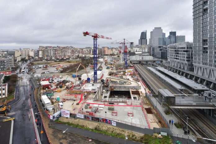 Sur environ quatre hectares, le site des Groues constitue l’un des épicentres du chantier de la ligne 15 Ouest, où trois grues dominent désormais le paysage. D’un côté, les équipes d’IntenCité –le groupement mené par Vinci– s’activent pour creuser la gare de Nanterre selon la « méthode de la taupe ». Concrètement, une dalle en béton a été coulée, laissant quelques trémies pour l’évacuation des terres et l’acheminement des matériaux.