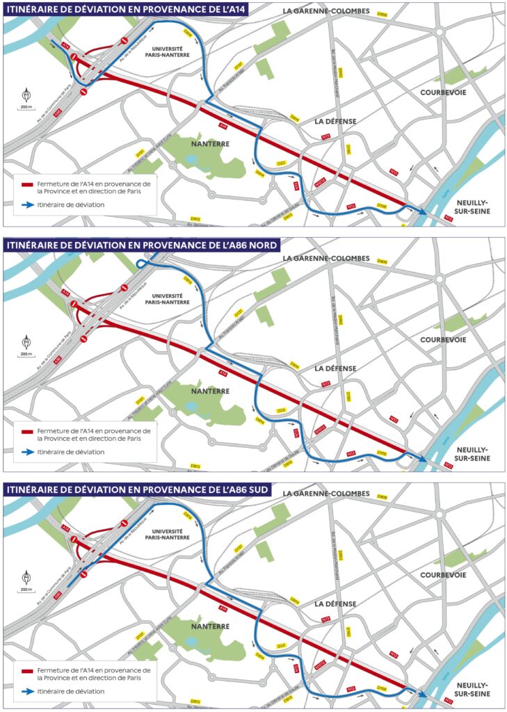 Des itinéraires de déviation sont mis en place. Les automobilistes venant de l’A86 et de l’A14 (sens province vers Paris) et souhaitant rejoindre La Défense puis Paris sont redirigés vers la RD914, puis le boulevard des Bouvets, de nouveau la RD914, et enfin le boulevard Patrick-Devedjian. « En amont du chantier, les panneaux à messages variables (PMV) du réseau afficheront en temps réel les conditions de circulation et les itinéraires de déviation », précise la Dirif. De fortes perturbations sont donc à prévoir dans le secteur de Nanterre –où des travaux se déroulent actuellement sur le boulevard de La Défense-, et il est fortement conseillé d’éviter le secteur.