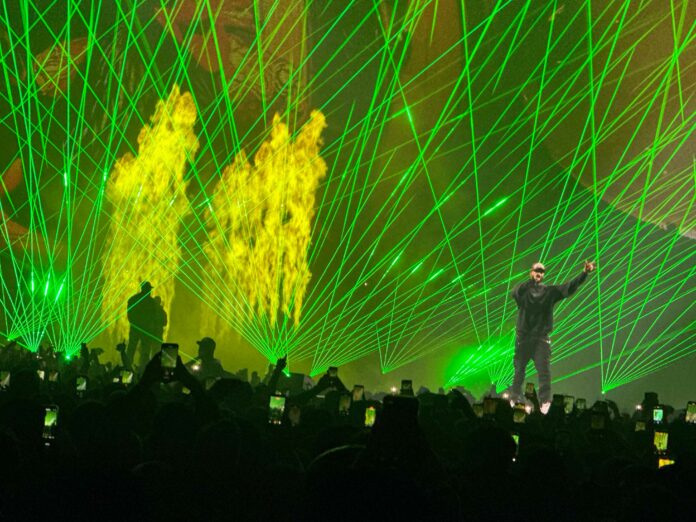 Au bout d’une quarantaine de minutes, la salle comble de 40 000 spectateurs commence à scintiller grâce aux bracelets lumineux distribués pour « Arc-en-ciel ». Et ça repart de plus belle avec « 6G » et « LVMH ». Durant la soirée, Booba partage la scène avec Aïshé pour « Ororo ».