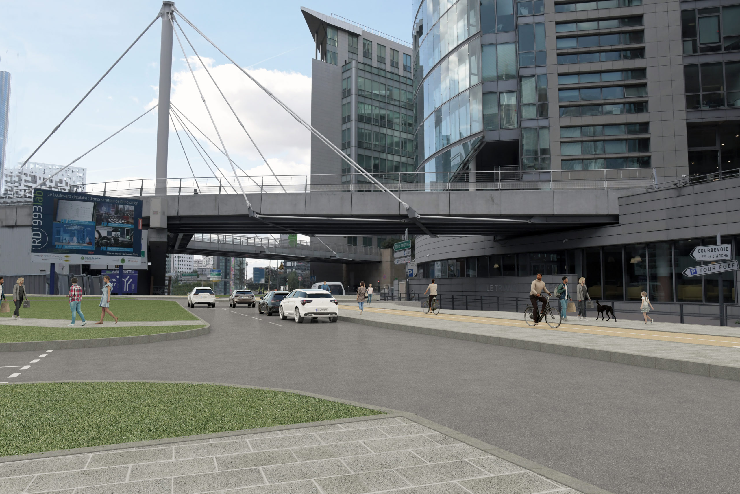 Le trafic se fera désormais uniquement par le boulevard Aimé Césaire où débouchera la sortie du tunnel de Nanterre – La Défense (A14) et dans la continuité par le boulevard des Bouvets qui se connectera au boulevard Patrick Devedjian, sous l’immeuble Belvédère (Spaces), au niveau du pied de l’Arche. Le boulevard Franck Kupka passera à double sens et permettra depuis le boulevard Patrick Devedjian de rejoindre Nanterre. Le tout sera accompagné par des plantations d’arbres et la création de nouvelles pistes cyclables.