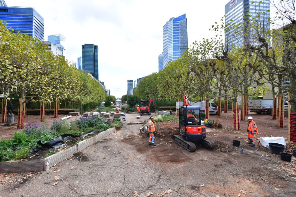 L’établissement public Paris La Défense a lancé, en grande pompe et aux côtés de nombreux élus locaux, à la fin de l’été, ce chantier de mutation urbaine. Cet espace central du quartier d’affaires, jusqu’alors plus minéral que végétal et aligné dans l’axe historique, entame sa mue pour devenir, d’ici 2028, un parc urbain de cinq hectares. Baptisé Le Parc, il s’étirera sur 600 mètres, de la Fontaine Agam au Bassin Takis.