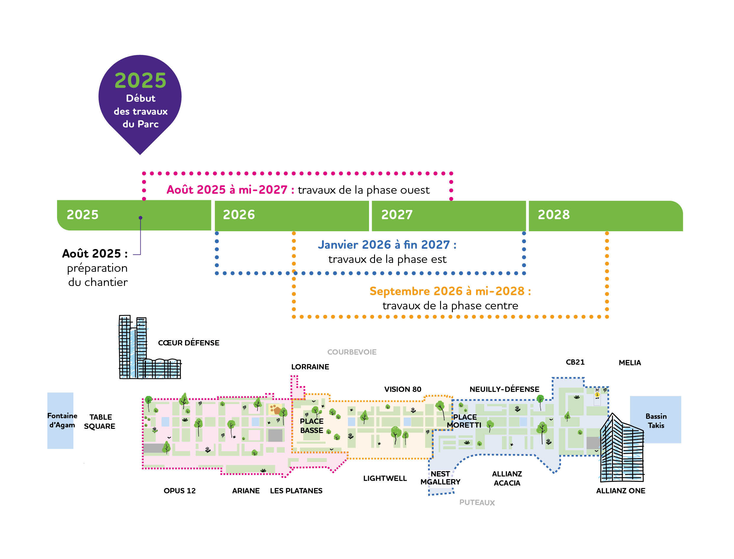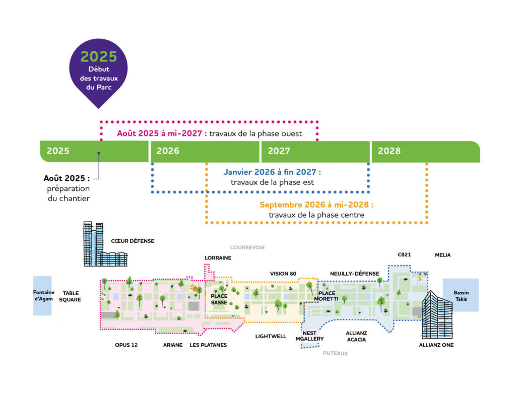 Mais pour profiter du Parc, il faudra patienter. Le chantier sera mené en trois phases jusqu’à la mi-2028, « de manière à maintenir l’accessibilité de l’Esplanade durant les travaux », précise Paris La Défense. Les entreprises mandatées interviendront sur différents lots : aménagements sur dalle, éclairage, arrosage et bassins, plantations et mobilier.