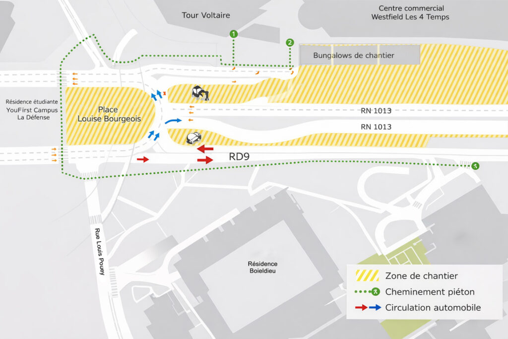 Cette modification entraîne le transfert de la RD9 (dans le sens La Défense vers Puteaux–Nanterre) plus au Nord, du côté de la résidence Boieldieu (au Sud), transformant ainsi la route en double sens. Un déplacement de la chaussée au niveau de la place Louise Bourgeois a également été opéré, tout comme une adaptation des voies couvertes à l’entrée de la gare routière.