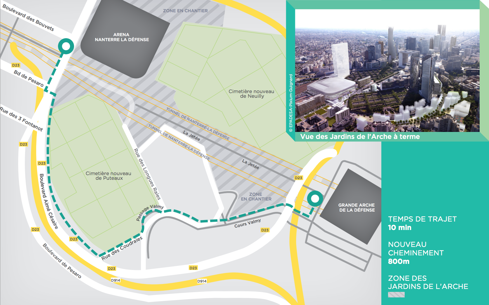 Pour relier les deux quartiers, il faut désormais passer par le pied des tours de la Société-Générale puis longer le cimetière de Puteaux par le boulevard de Pesaro. Ce nouvel itinéraire d’environ 800 mètres soit 150 mètres de plus que l’ancien, est selon Defacto « plus sécurisé » et ne comporte aucune marche. Ce cheminement sera pérenne pendant toute la durée du chantier jusqu’à début 2017.