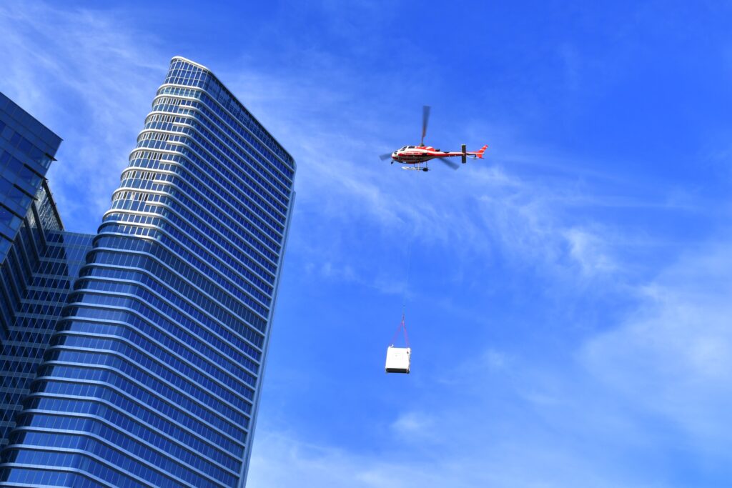C’est pour hisser sur la terrasse de l’immeuble Acacia treize gros paquets contenant des éléments de Centrale de Traitement d’Air (CTA) de la marque Carrier, avec un poids allant de 300 kilos à une tonne, que l’aéronef a été appelé en renfort par Dumez. La filiale de Vinci mène depuis l’été dernier la rénovation de cet immeuble érigé dans les années 1980, appartenant à Allianz.