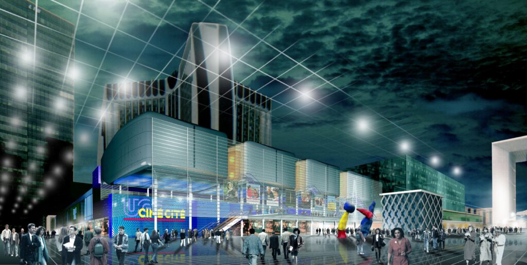 Pour dessiner son nouveau multiplexe, UGC s’entoure de son architecte fétiche, l’Italien Alberto Cattani, et investit environ 20 millions d’euros. Relié par une passerelle de verre connectée à la nouvelle extension du centre baptisée le Dôme (où de nombreux restaurants sont déployés), l’UGC Ciné Cité de La Défense se compose de seize salles ultramodernes pour plus de 3 600 fauteuils, dont une particulièrement impressionnante. Si UGC abandonne le format Imax, la salle du Dôme perdure avec un écran de 135 mètres carrés accompagné de 394 sièges.