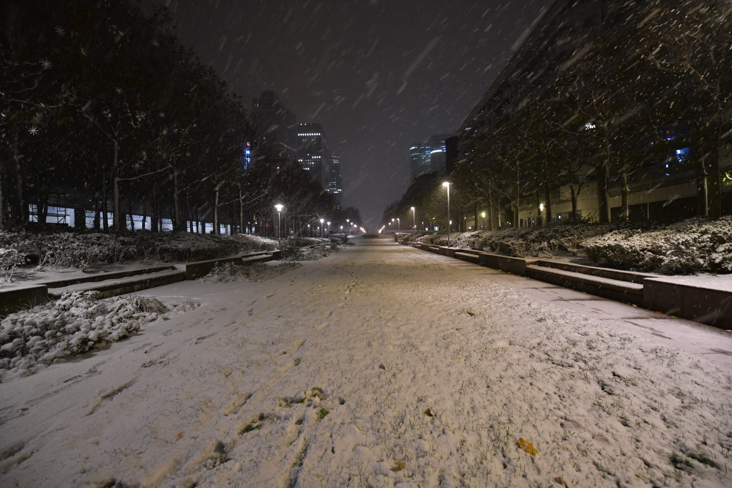 Let It Snow ! Let It Snow ! Let It Snow ! Les premiers flocons de la saison sont tombés à La Défense dans la nuit de samedi à dimanche. En deux heures à peine, le quartier d’affaires s’est retrouvé recouvert d’un fin manteau blanc de quelques centimètres.
