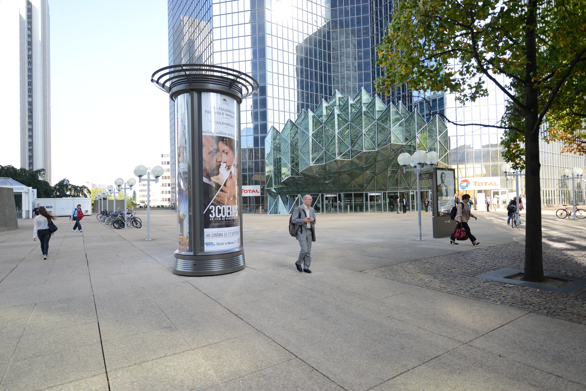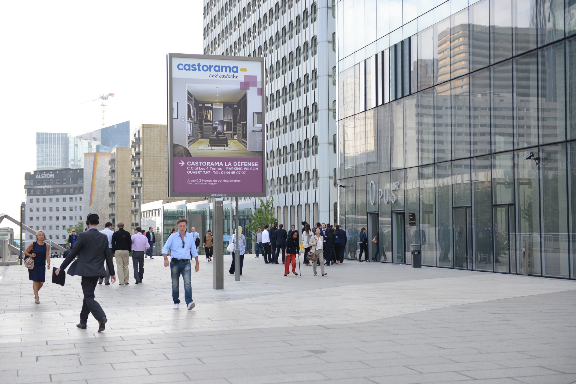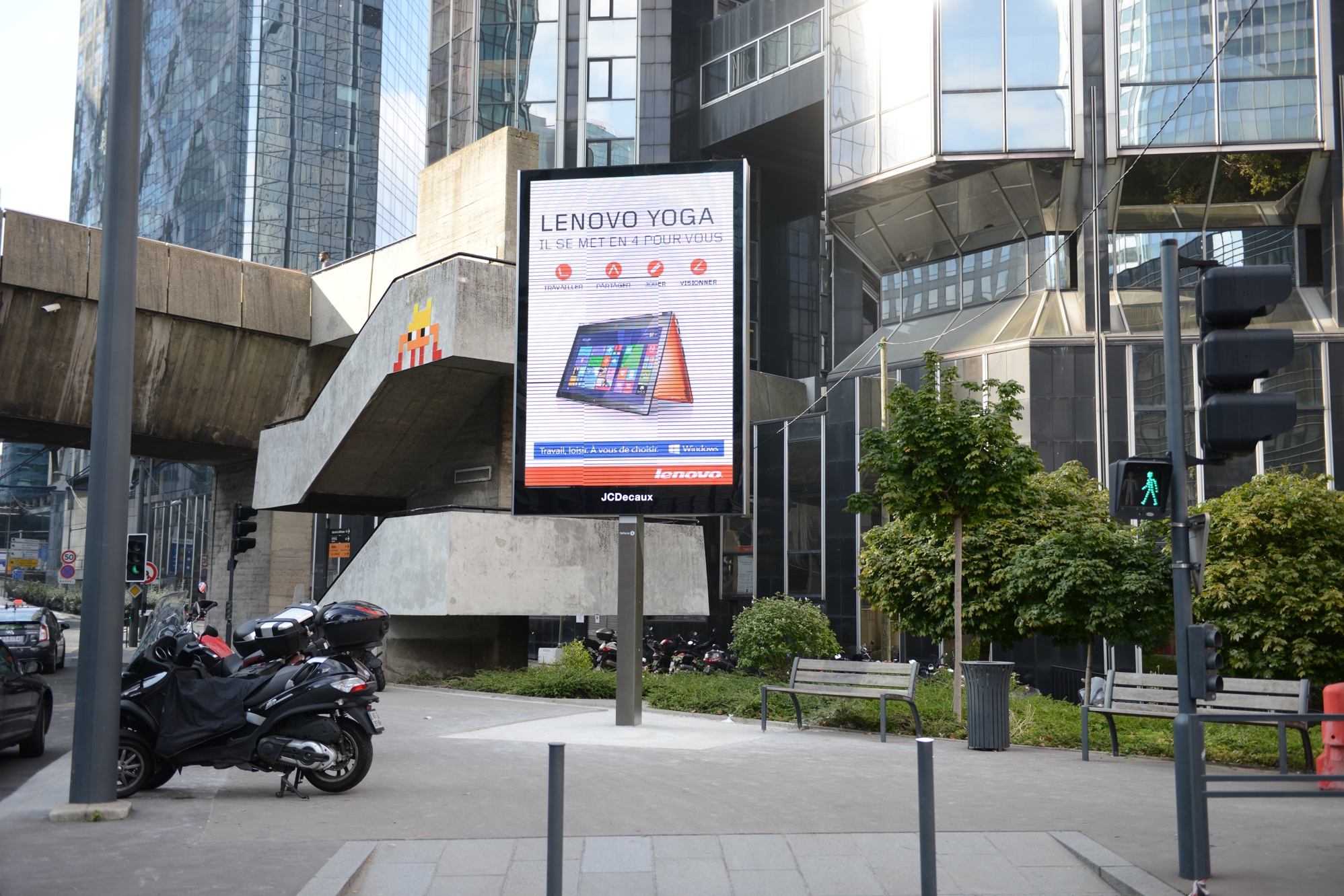 Un panneau « Mupi » au pied de la tour Opus 12 – Defense-92.frD’autres panneaux « Mupi » de deux mètres carrés au format papier plus « classique » ont été installés un peu partout dans le quartier d’affaires. Ces Mupi représentent quatre-vingt faces.