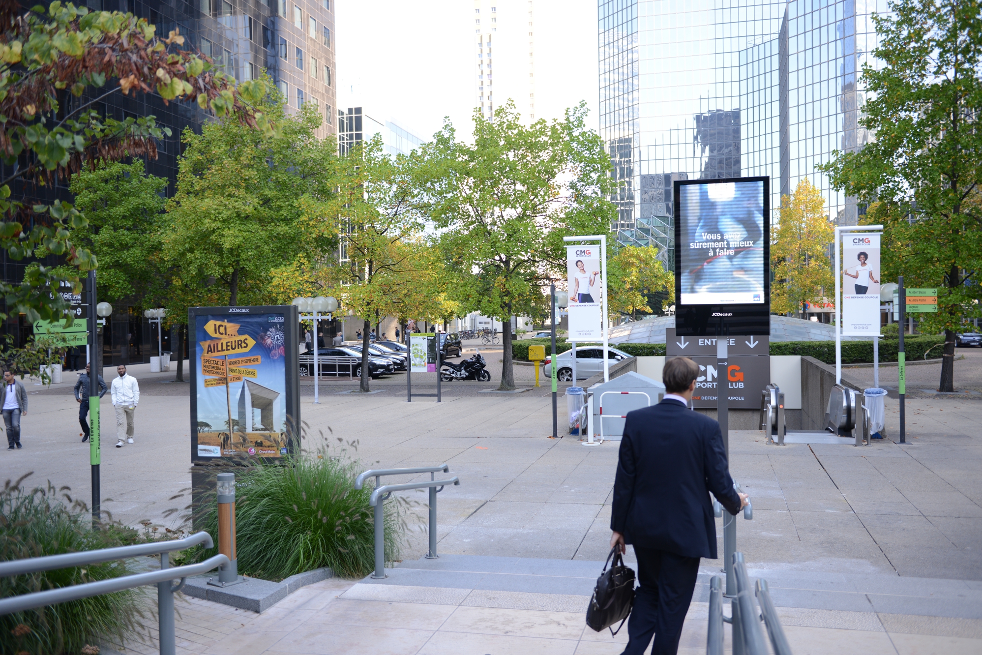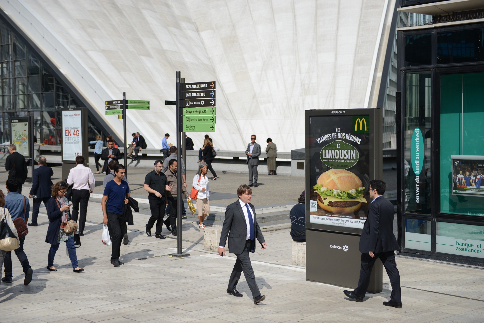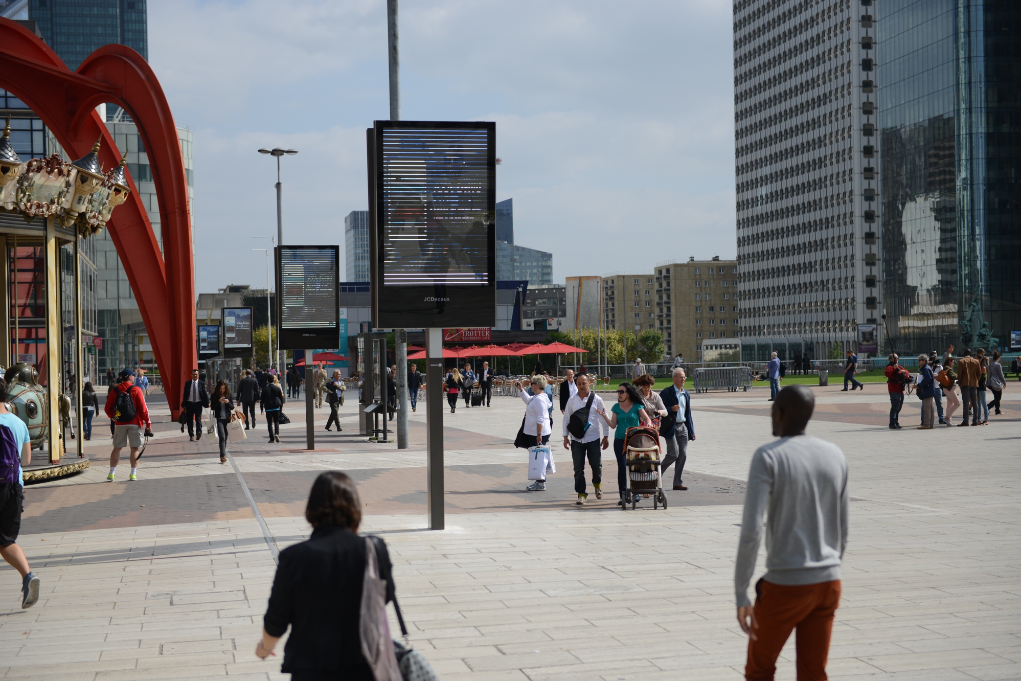 Absents du paysage de La Défense depuis la fin du contrat avec l’afficheur CBS Outdoor en mai 2010, les panneaux publicitaires sont de retour dans le quartier, mais cette fois-ci avec un mobilier hight-tech et innovant. Et pour l’exploitation c’est la société française JC Decaux qui exploite l’ensemble des panneaux implantés à la fin août sur la dalle de La Défense et sur le boulevard circulaire et ses abords. Première en France: une cinquantaine de panneaux numériques de deux mètres carrés ont été déployés, principalement sur le Parvis de La Défense, la Place de La Défense et l’Esplanade du Général de Gaulle.