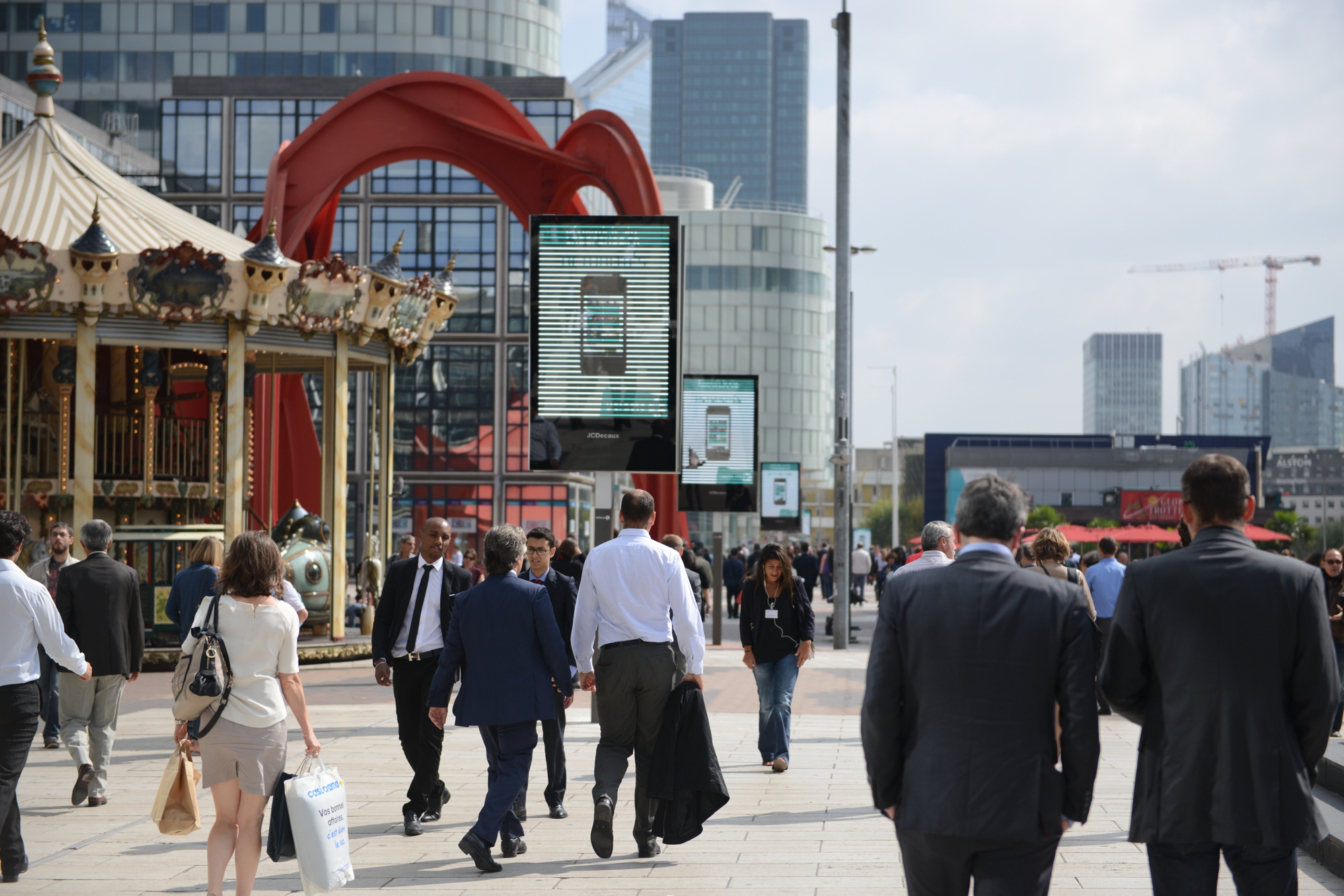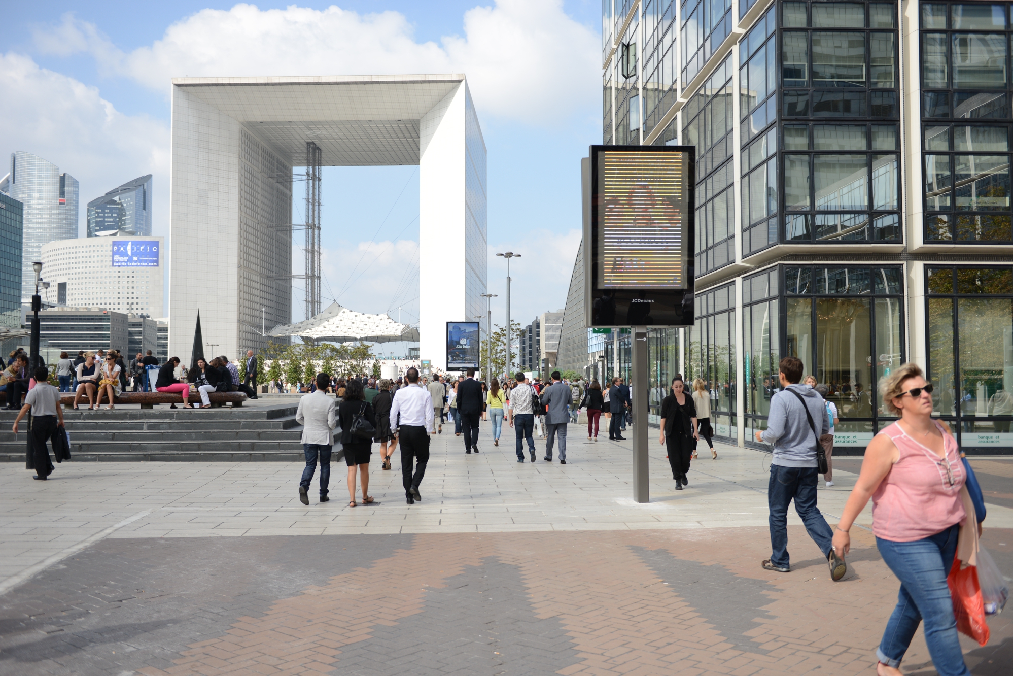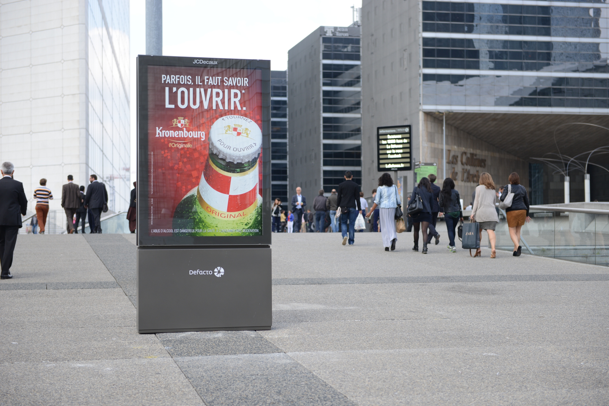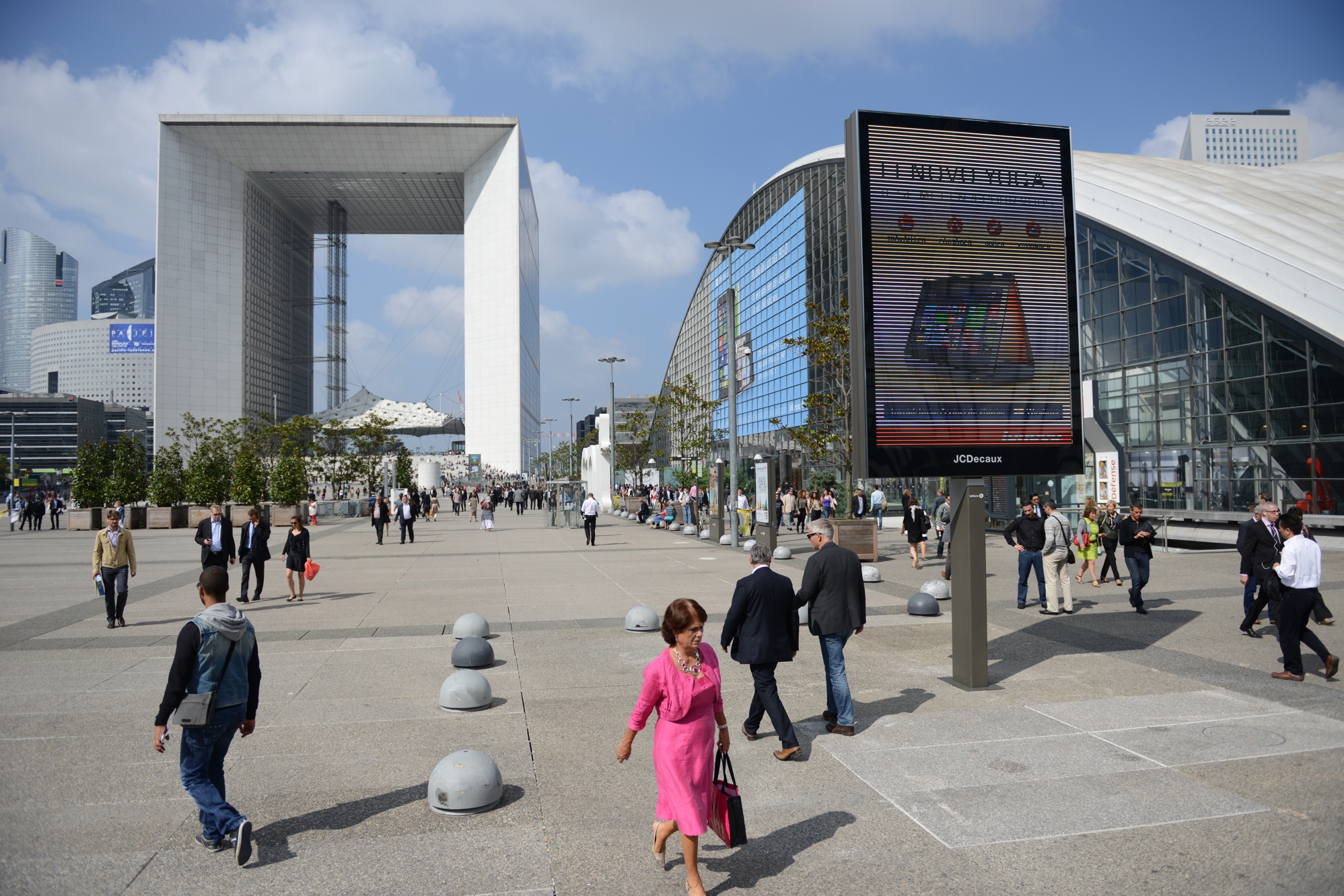 Absents du paysage de La Défense depuis la fin du contrat avec l’afficheur CBS Outdoor en mai 2010, les panneaux publicitaires sont de retour dans le quartier, mais cette fois-ci avec un mobilier hight-tech et innovant. Et pour l’exploitation c’est la société française JC Decaux qui exploite l’ensemble des panneaux implantés à la fin août sur la dalle de La Défense et sur le boulevard circulaire et ses abords. Première en France: une cinquantaine de panneaux numériques de deux mètres carrés ont été déployés, principalement sur le Parvis de La Défense, la Place de La Défense et l’Esplanade du Général de Gaulle.