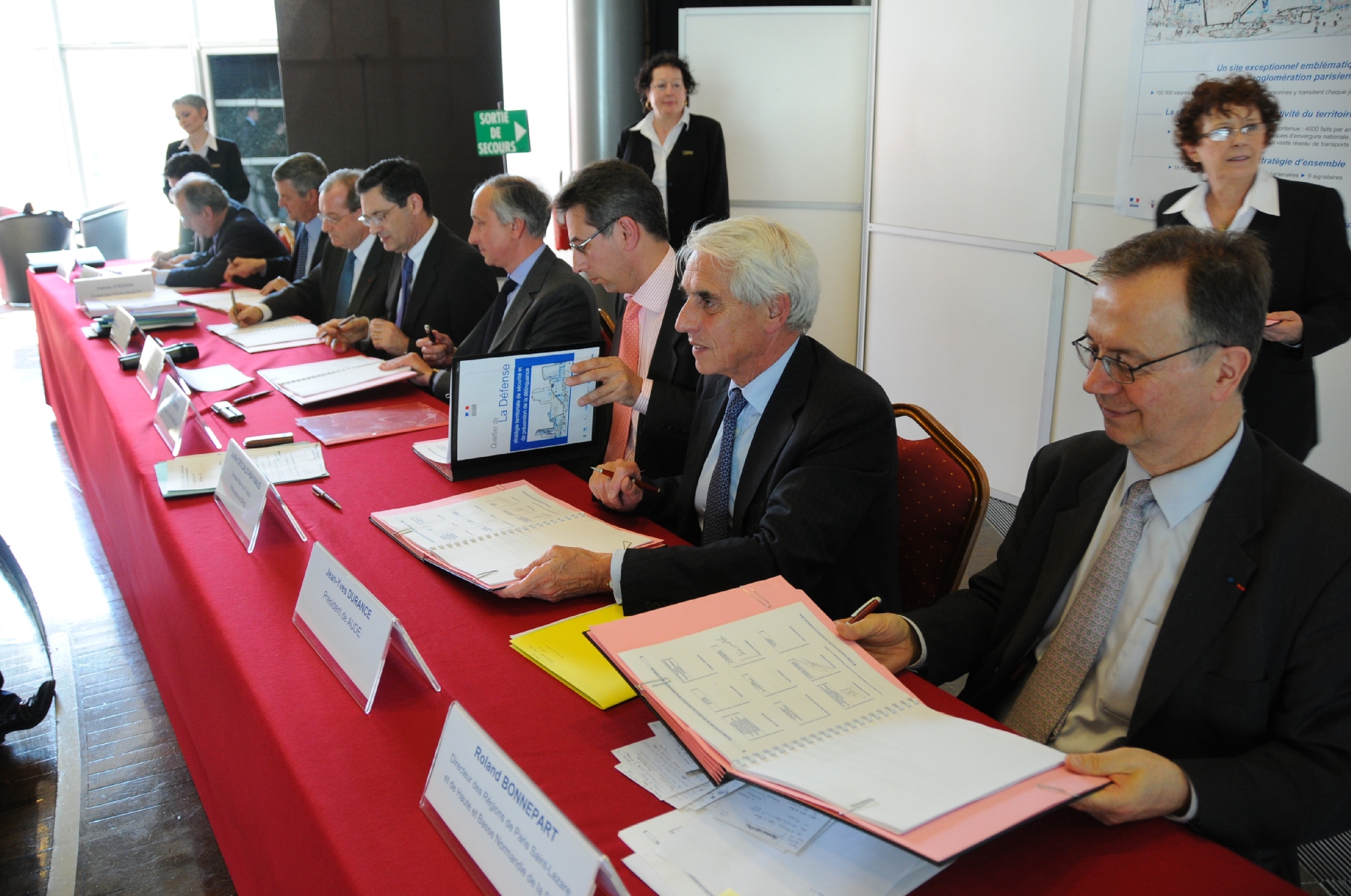 Afin de lutter le plus efficacement possible le vendredi 16 avril 2010 sur le Toit de La Grande Arche, Patrick Devedjian, Ministre auprès du Premier ministre chargé de la mise en œuvre du plan de relance et Président du Conseil général des Hauts-de-Seine, Président de DEFACTO ; Joelle Ceccaldi Raynaud, Députée-maire de Puteaux, Présidente de l’EPAD, représentée par Jean-Philippe Lotteau; Jacques Kossowski, Député-maire de Courbevoie; Michel Gaudin, Préfet de Police; Patrick Strzoda, Préfet des Hauts-de-Seine; Philippe Courroye, Procureur de la République de Nanterre; Roland Bonnepart, Directeur des Régions de Paris Saint-Lazare et de Haute et Basse Normandie de la SNCF; Emmanuel Pitron, Directeur de Cabinet du président de la RATP et Jean-Yves Durance, Président de l’association AUDE ont signé « la stratégie de sécurité et de prévention de la délinquance du quartier d’affaires de La Défense ». Ce document fixe les objectifs et méthodes pour lutter contre la délinquance dans le quartier.