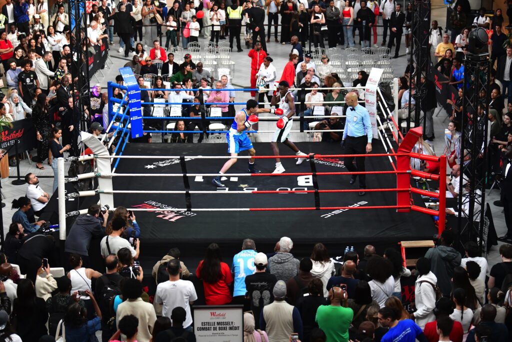 La Clairière du Westfield Les 4 Temps s’est transformée en arène de combat. Pour son grand retour devant le public français, Estelle Mossely est montée sur le ring ce jeudi, au cœur du centre commercial. La championne olympique de Rio 2016 a signé un retour victorieux en s’imposant aux points face à la Colombienne Bexcy Mateus, lors d’un combat inédit précédé d’autres affrontements organisés par la Fédération française de boxe (FFB), d’une scène de théâtre autour des violences faites aux femmes portée par Séverine Ferrer, ainsi que d’un showcase.