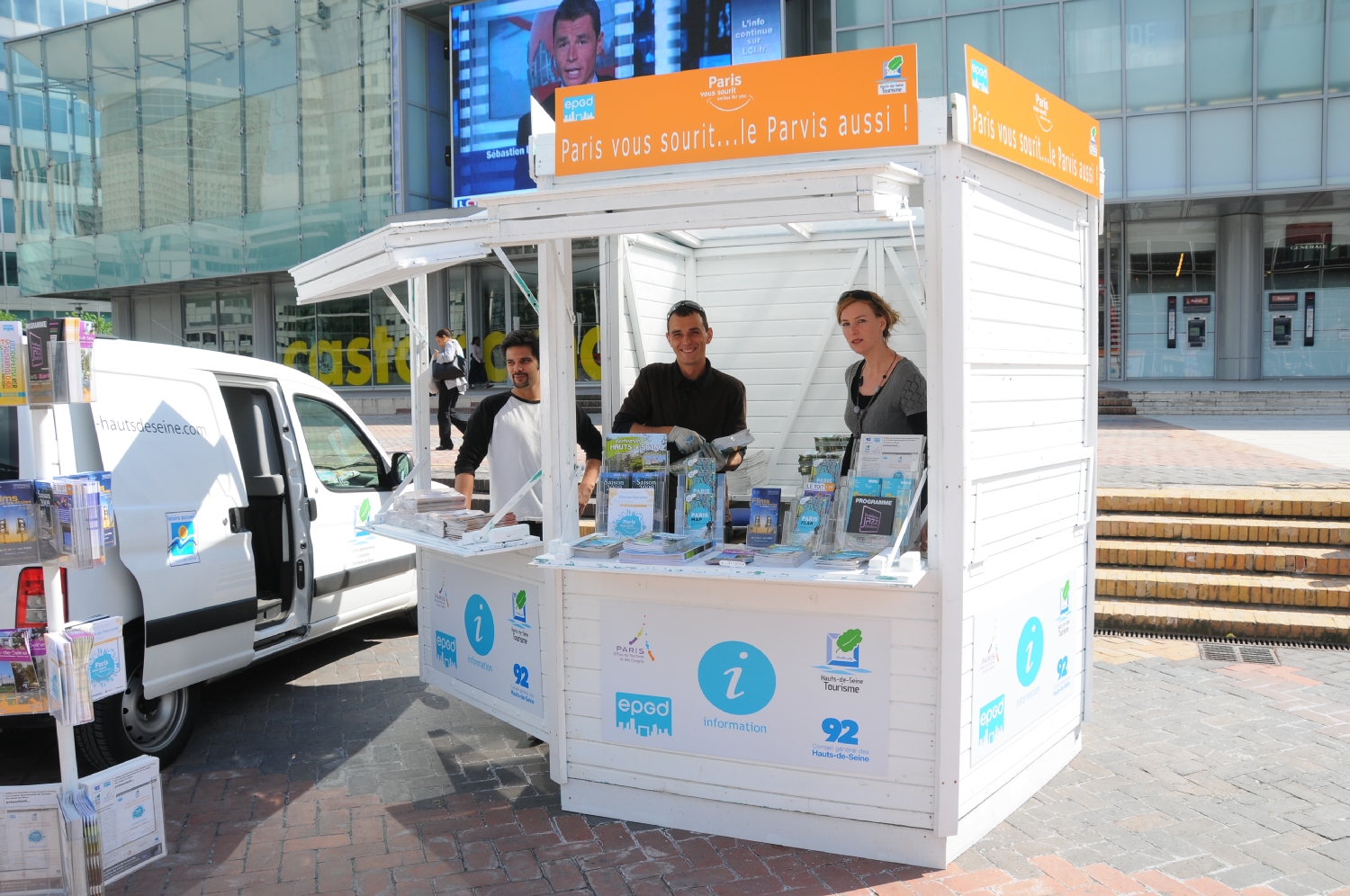 L’office du tourisme de Paris en collaboration avec le comité départemental de tourisme des Hauts-de-Seine s’associe pour l’opération « Paris vous sourit » jusqu’au 13 juillet 2009. Cinq kiosques d’informations sont installés dans Paris sur les Champs Elysées, à l’Hôtel de Ville, à la Bastille, à Notre-Dame, au Trocadéro et sur la place de La Défense. Des brochures touristiques des Hauts-de-Seine seront distribuées dans les points parisiens et réciproquement des brochures sur Paris seront distribuées dans le point de La Défense. Cette campagne a pour bût de présenter aux Franciliens avant tout, les évènements qui se dérouleront dans Paris et les Hauts-de-Seine cet été ainsi que la fête du Tourisme qui se déroulera du 10 au 13 juillet 2009. 200 professionnels se rassembleront à La Défense le 30 juin pour une assemblée générale sur le tourisme Parisien. Le kiosque de La Défense est ouvert tous les jours de 11h à 19h.
