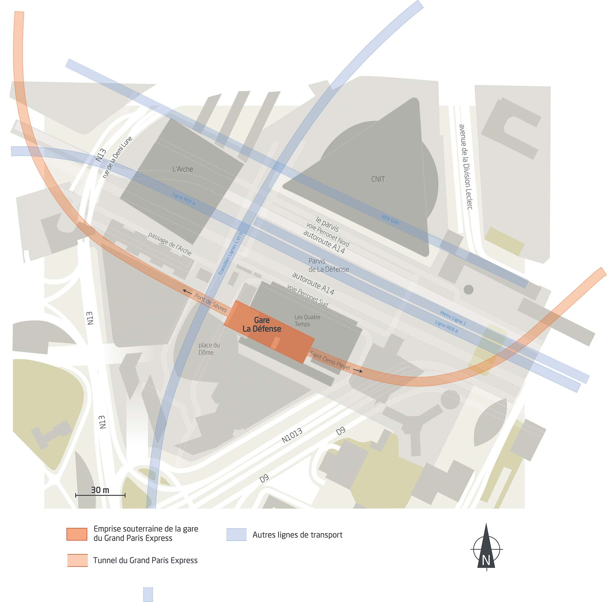 Le plan du futur hub de transports à La Défense en 2027 avec le Grand Paris Express et le RER E - DR
