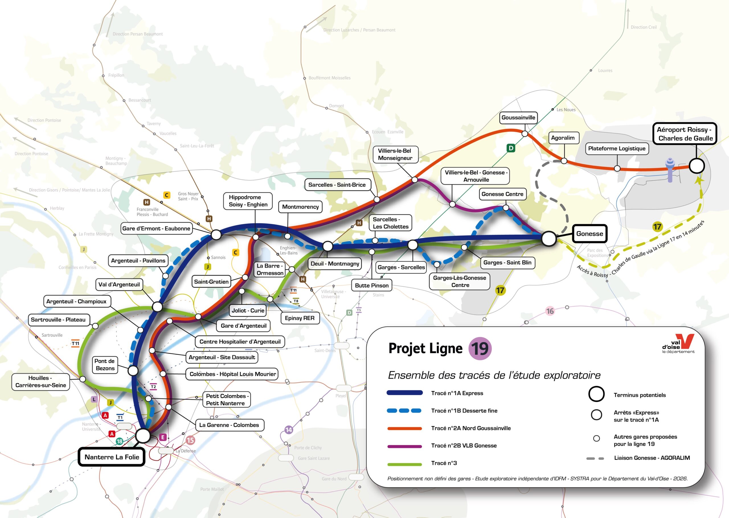 Le premier tracé (1A) relie Nanterre-La Folie à Gonesse, avec deux variantes. La première, « express », privilégie la vitesse commerciale en ne s’interconnectant qu’avec les gares des modes lourds. Longue de vingt-huit kilomètres, cette option serait composée de sept gares. L’autre option (1B) offre une desserte plus fine, notamment à Colombes, Argenteuil, Sarcelles et Garges-lès-Gonesse, avec des connexions aux lignes H, J, aux RER C et D et aux lignes 15, 17 et 18 Nord. Sa longueur, d’une trentaine de kilomètres, intégrerait quinze stations. Le coût est estimé à 4,8 milliards d’euros pour l’option 1A et 5,8 milliards d’euros pour l’option 1B.
