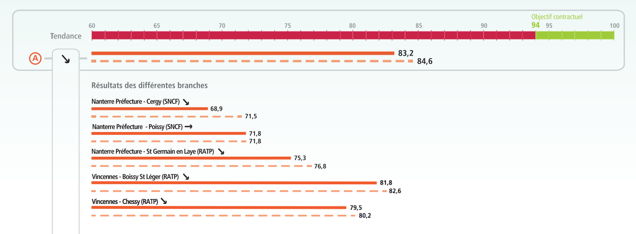 La ligne U qui relie La Défense à La Verrière a enregistré un taux de 93,1 % contre 91,2 % des trains à l’heure l’année précédente. L’objectif fixé par le STIF était de 94 %.