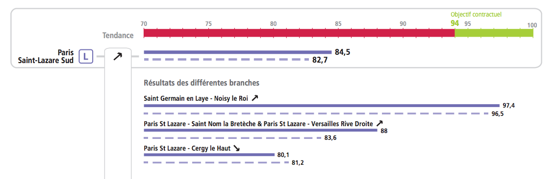 Sur la ligne L la situation s’arrange légèrement: 84,5 % des trains étaient à l’heure en ce début d’année contre 82,7 % en 2013. Seule la branche de Cergy n’a pas performé en passant de 81,2 % à 80,1 %. Les branches de Versailles Rive-Droite et Saint-Nom la Bretèche ont connu un mieux en passant de 83,6 % pour le début 2013 à 88 % . La branche de Saint Germain en Laye et Noisy le Roi, connait elle un bon de taux avec 97,4 % des trains à l’heure. La ligne est encore loin de l’objectif du STIF soit 94 % des trains à l’heure.