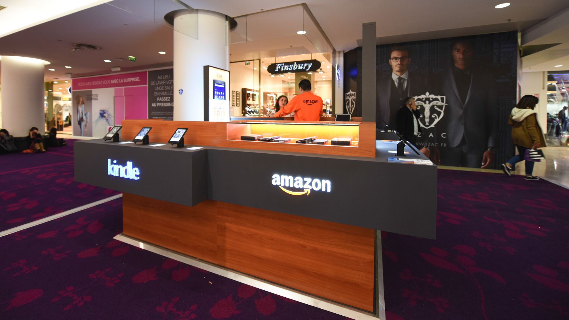 Le célèbre site de vente en ligne Amazon vient d’ouvrir en toute discrétion un pop-up store au sein du centre commercial des 4 Temps. Installé au niveau 2 en zone framboise, face à l’enseigne Kaporal, le kiosque présente et propose à la vente ses trois liseuses, la Kindle (69,99 euros) la Kindle Paperwhite (129,99 euros) et la Kindle Voyage (189,99 euros). Sa tablette numérique Fire vendue à 59,99 euros est également disponible. Amazon propose par ailleurs des bons d’achat à la vente.