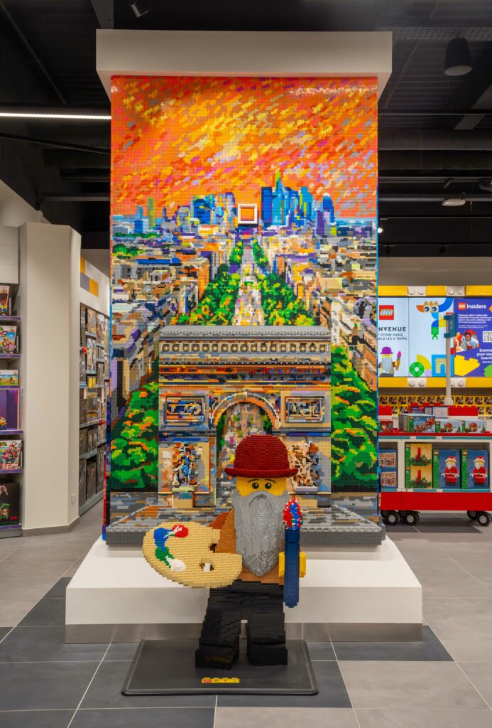 Située dans un passage stratégique du mall, face au McDonald’s, à l’emplacement de l’ancien Etam, la boutique s’étend sur 233 mètres carrés. Au centre de l’espace, une monumentale création de plus de 100 000 briques accueille les visiteurs. Derrière un peintre, mascotte de la boutique, un poteau se transforme en tableau pixelisé du quartier d’affaires, formé de milliers de petites pièces. On y trouve également une Grande Arche entièrement construite en Lego.